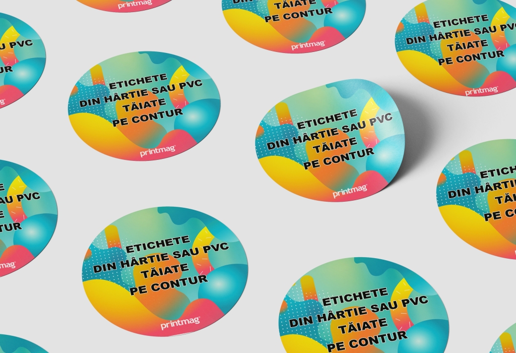 Tiparim stickere si etichete autocolante personalizate decupate pe contur in cantitati mici, medii si mari. Printul este realizat pe tipar digital iar suportul poate fi din hartie sau PVC.